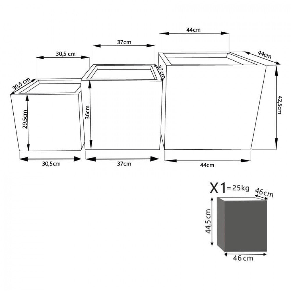 Dimensions: cm g. 44 x 44 x 42.5 h/m. 37 x 37 x 36 h / p. 30.5 x 30.5 x 29.5 h