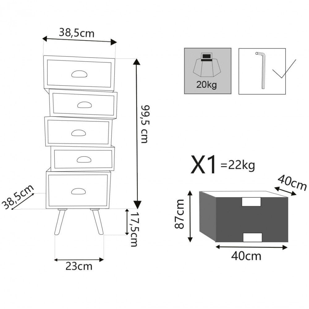 Struttura in mdf, gambe in legno di pino, top colore marrone 5 cassetti colorati