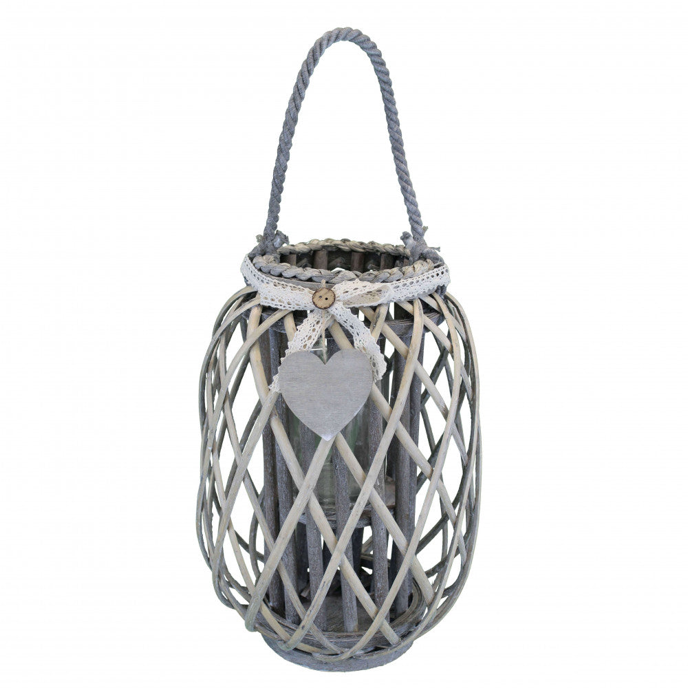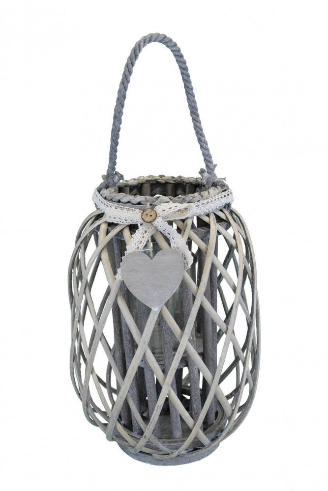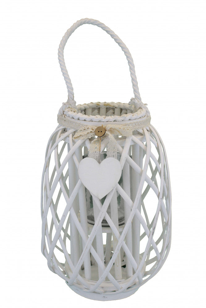 Lanterna bianca in vimini e vetro con nastro in pizzo e decoro a cuore