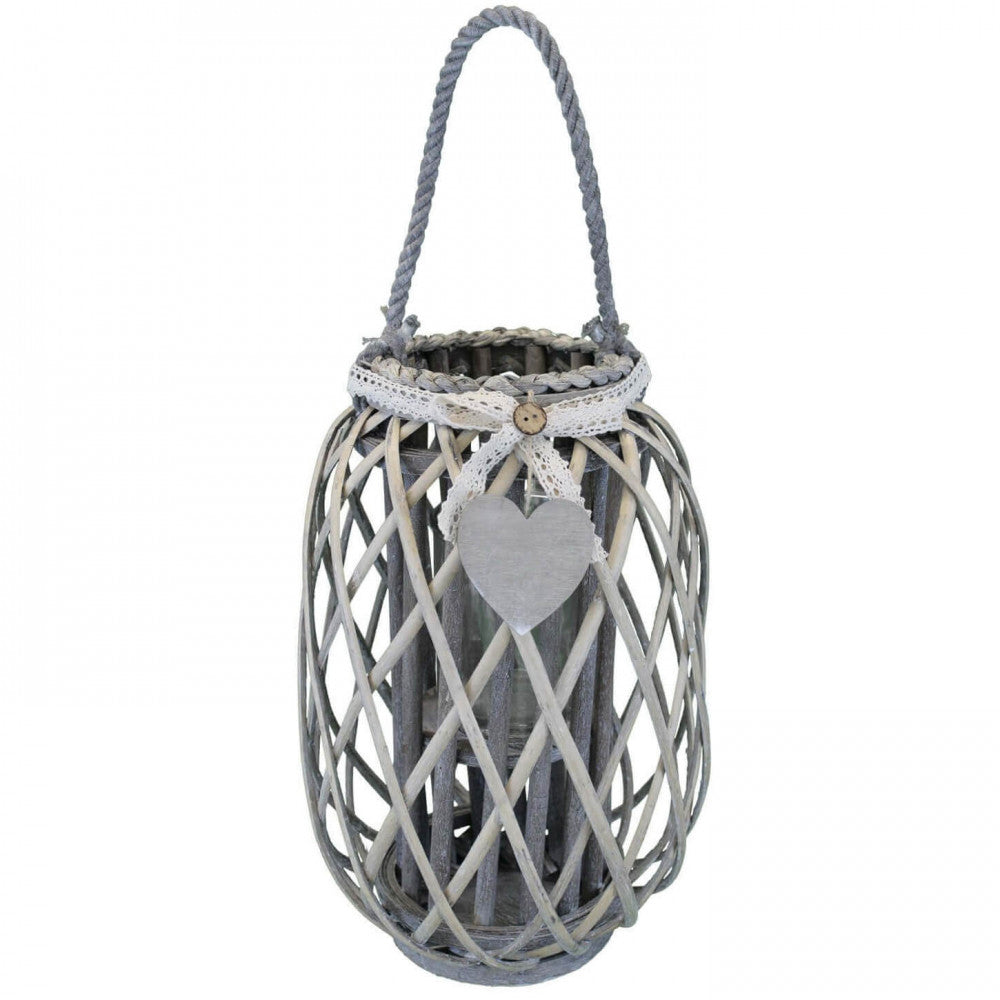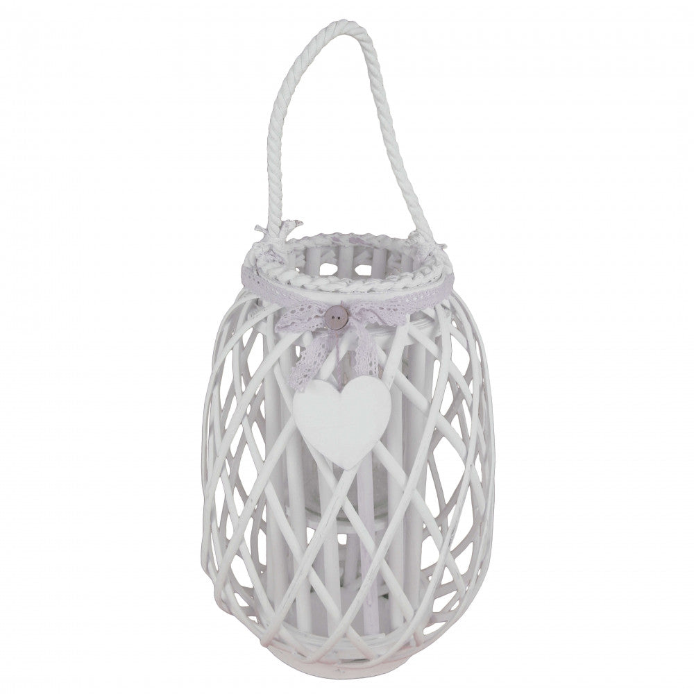 Lanterna bianca in vimini e vetro con nastro in pizzo e decoro a cuore