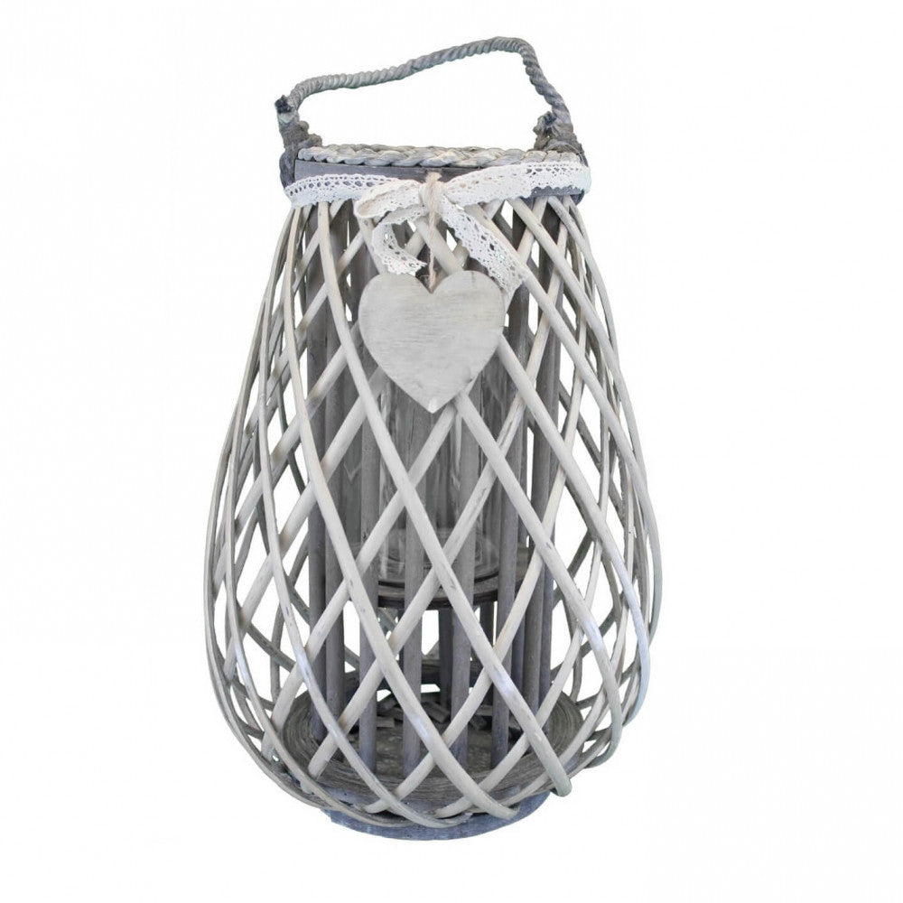 Lanterna bianca in vimini e vetro con nastro in pizzo e decoro a cuore