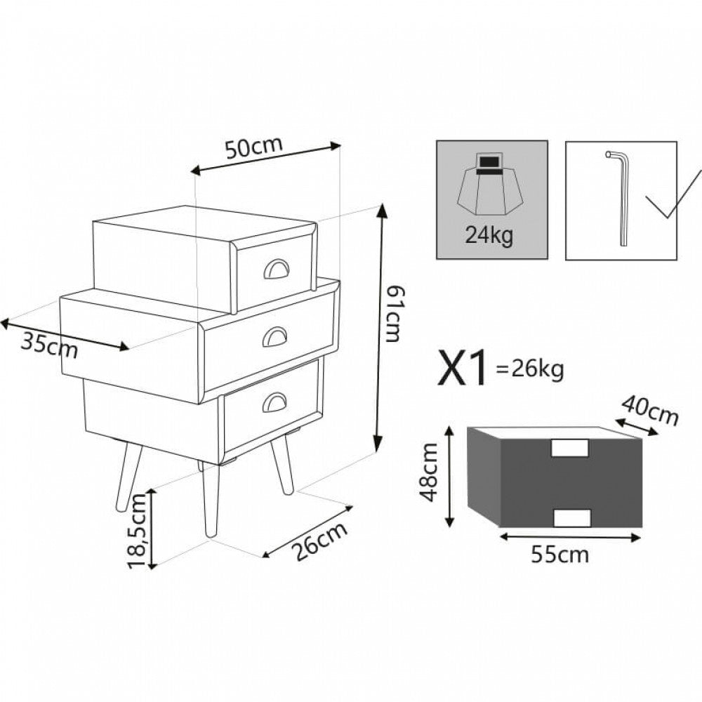 Struttura in mdf, gambe in legno di pino, top colore naturale 3 cassetti colorati