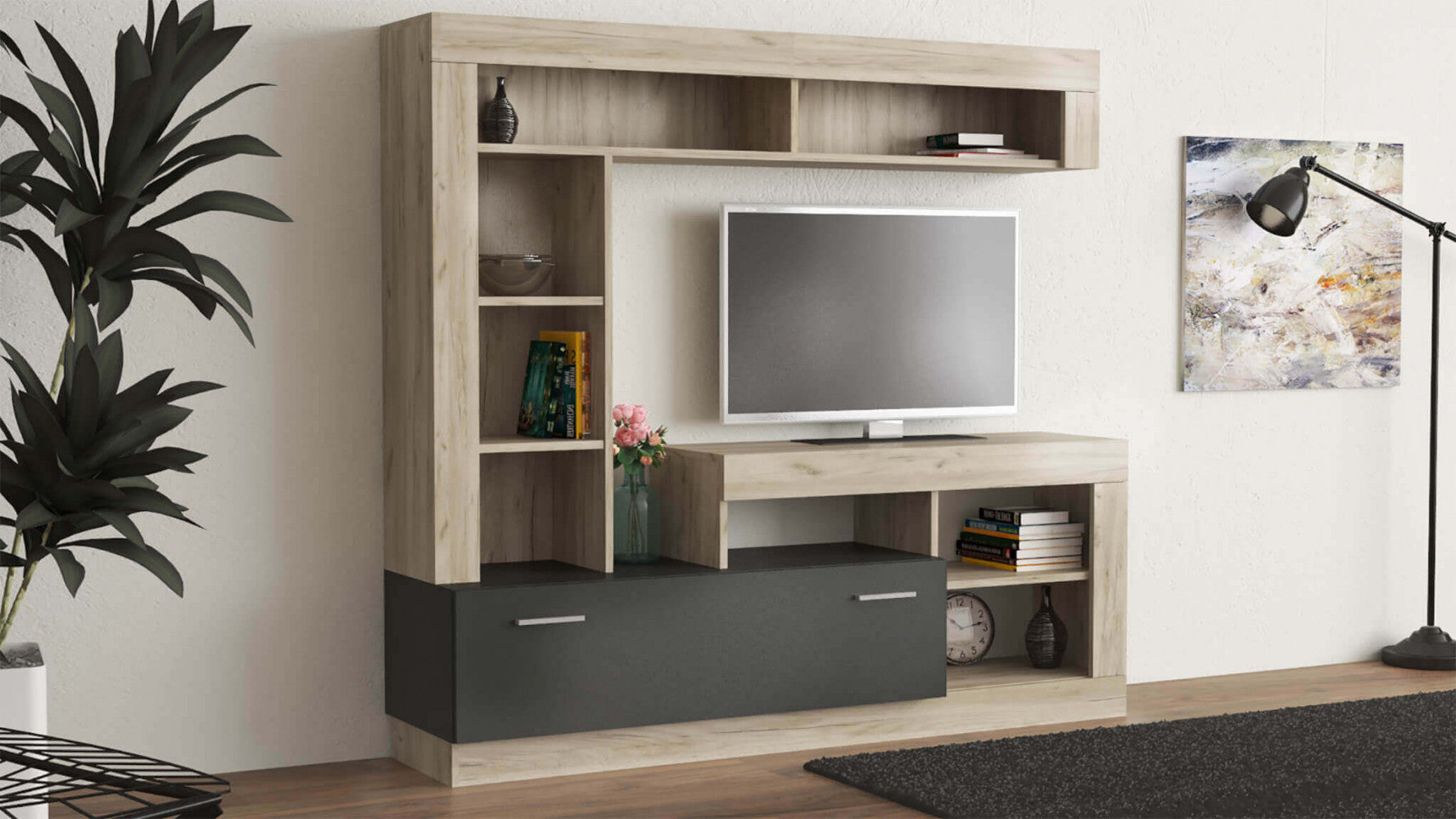 Parete soggiorno leonard antracite e olmo
