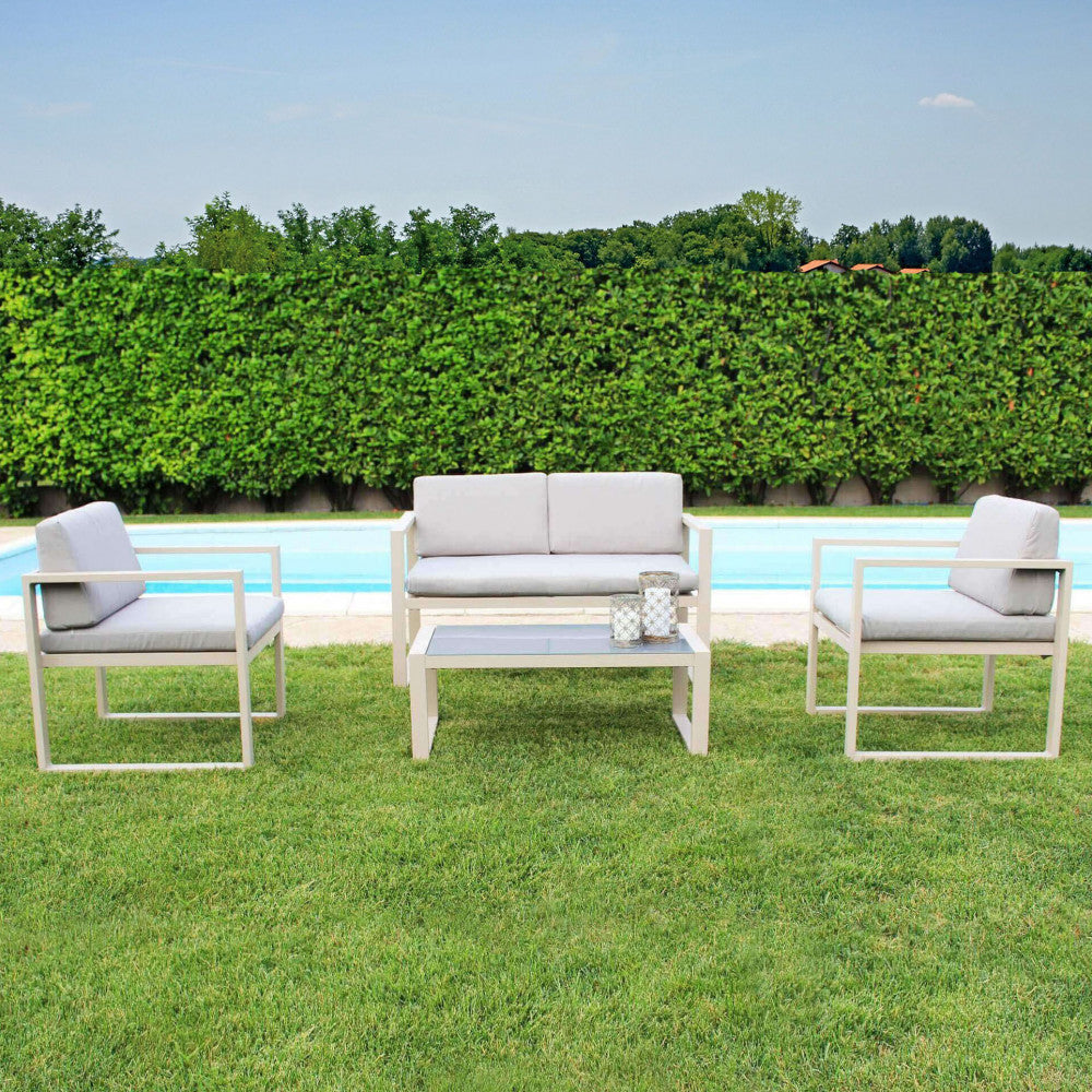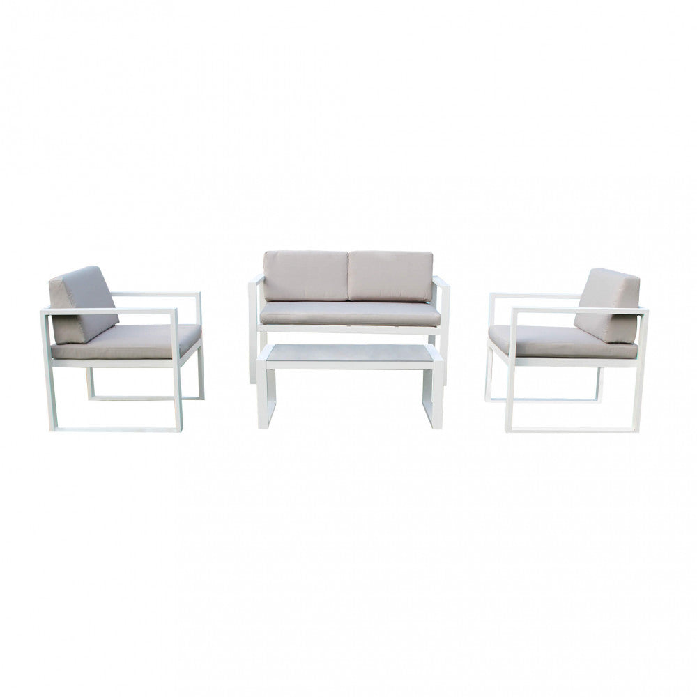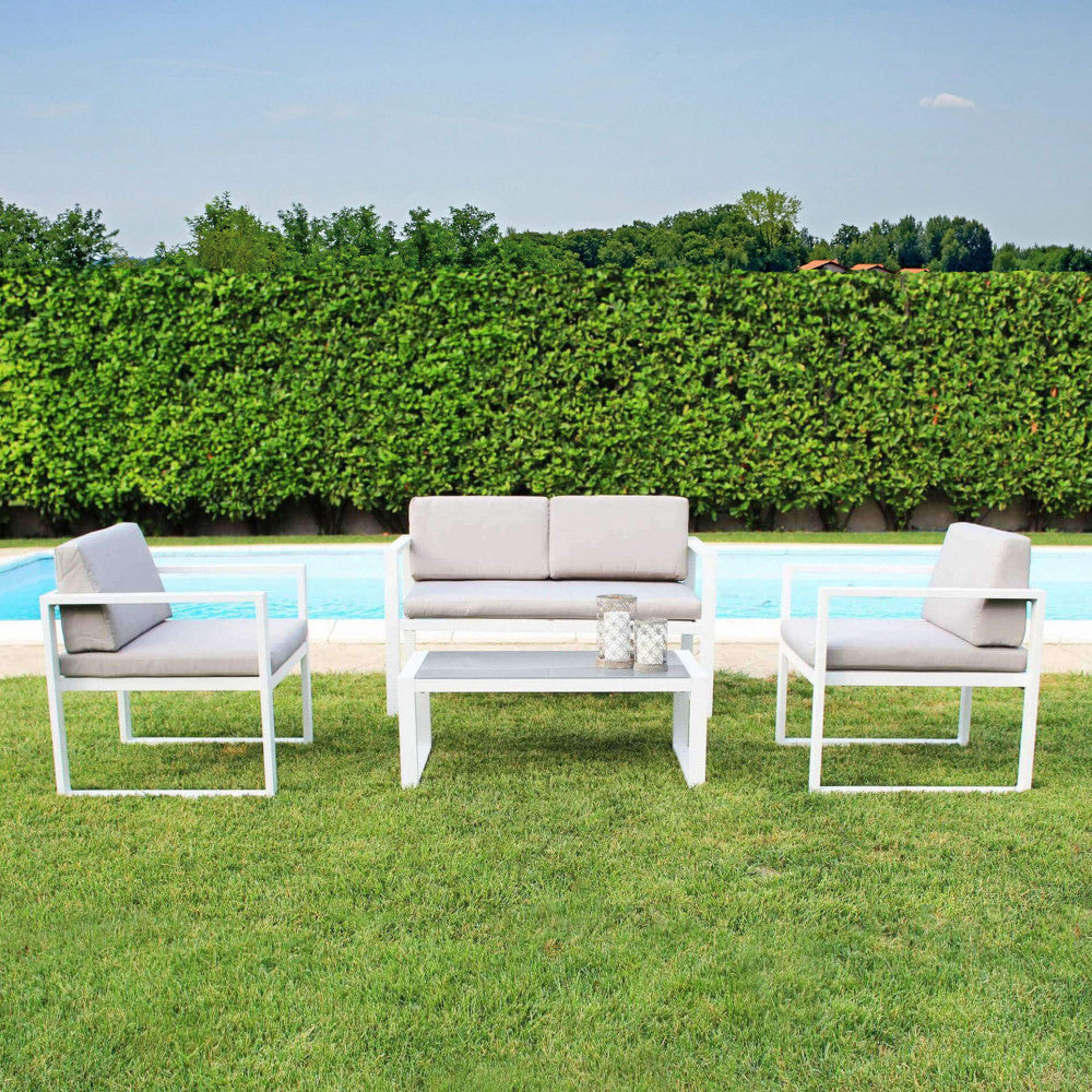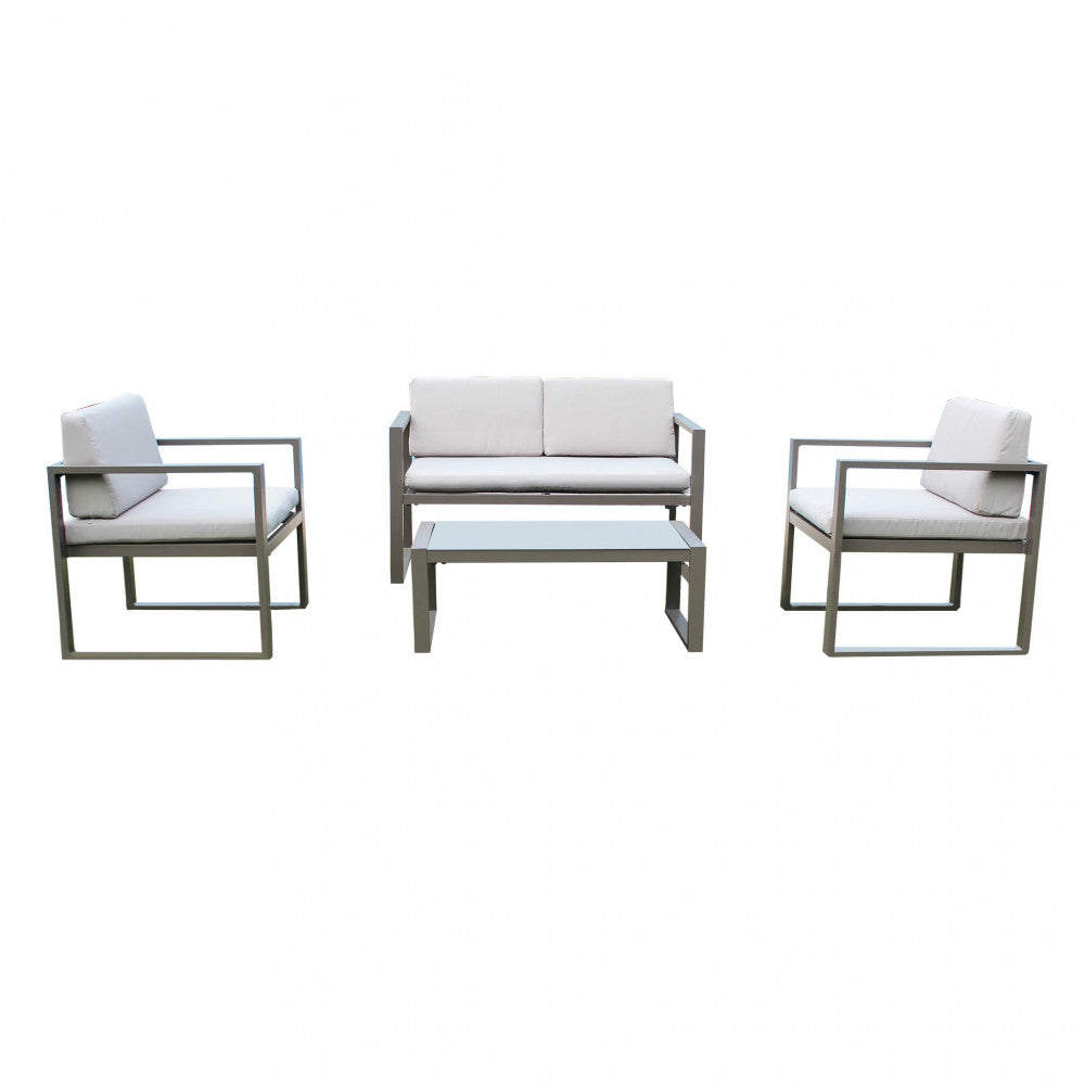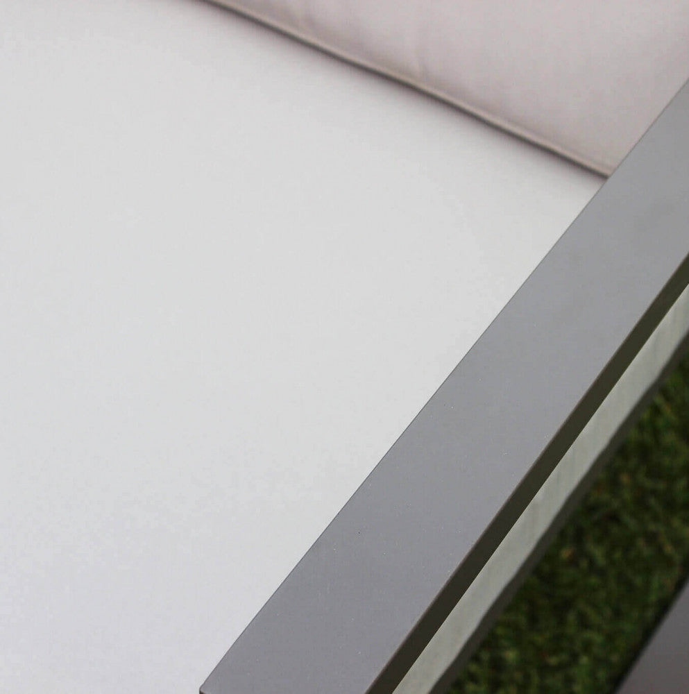 Struttura in alluminio verniciato bianco, tortora, taupe o antracite, cuscini in poliestere vetro tavolino 5 mm