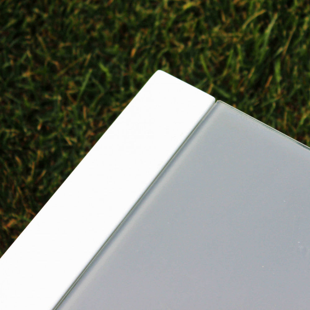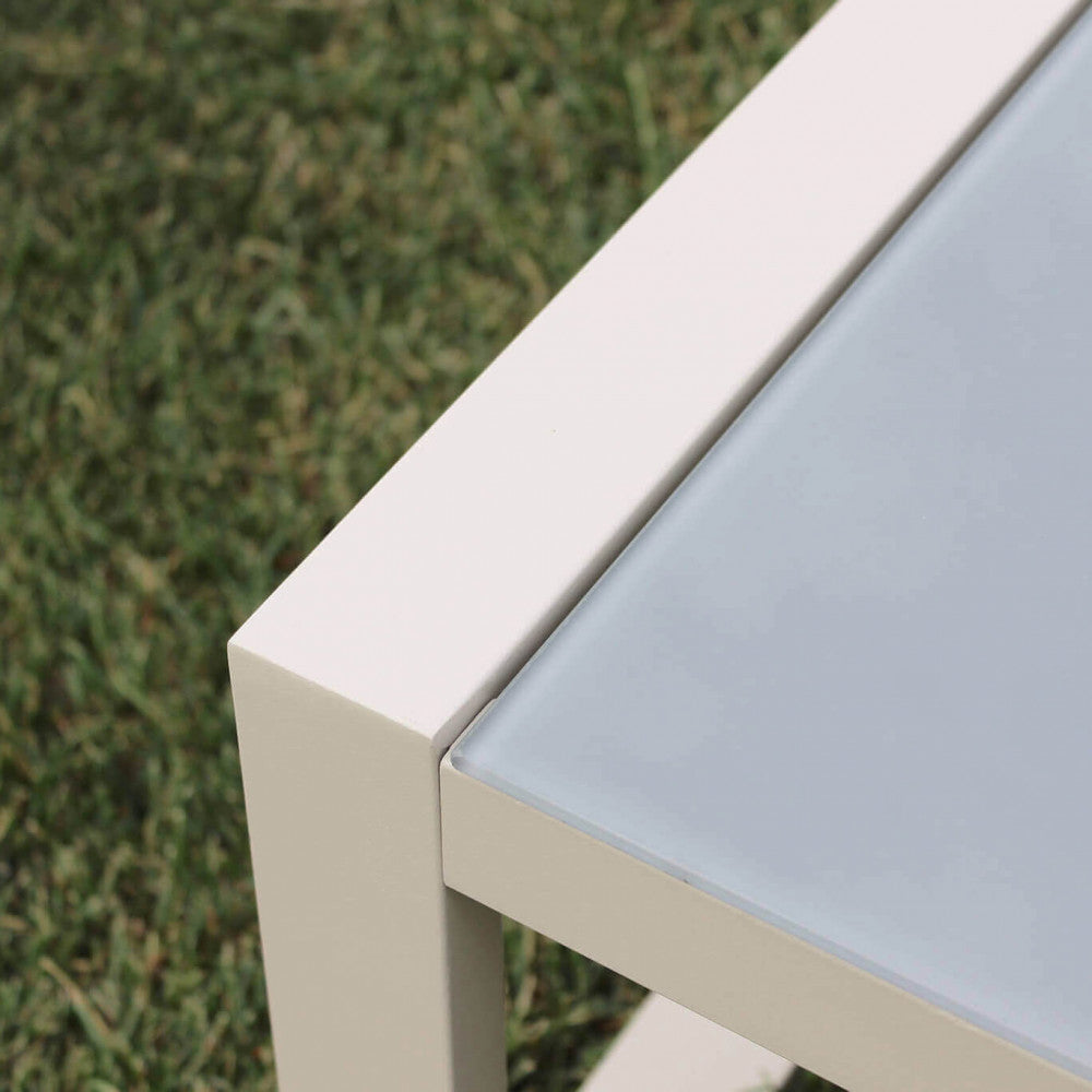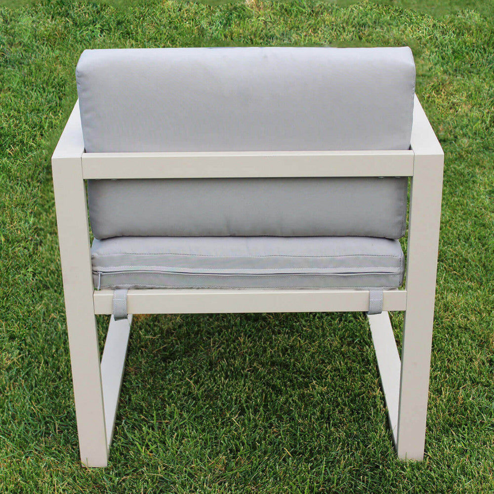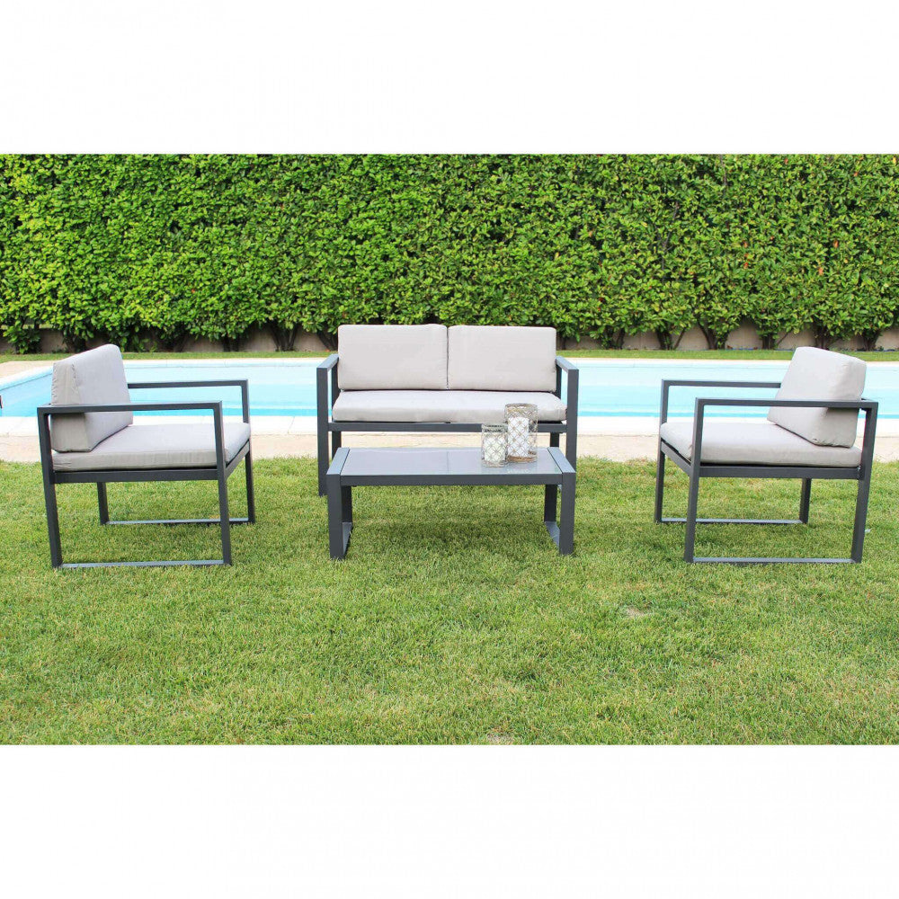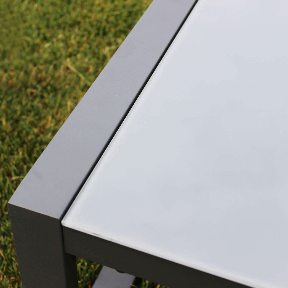 Struttura in alluminio verniciato bianco, tortora, taupe o antracite, cuscini in poliestere vetro tavolino 5 mm