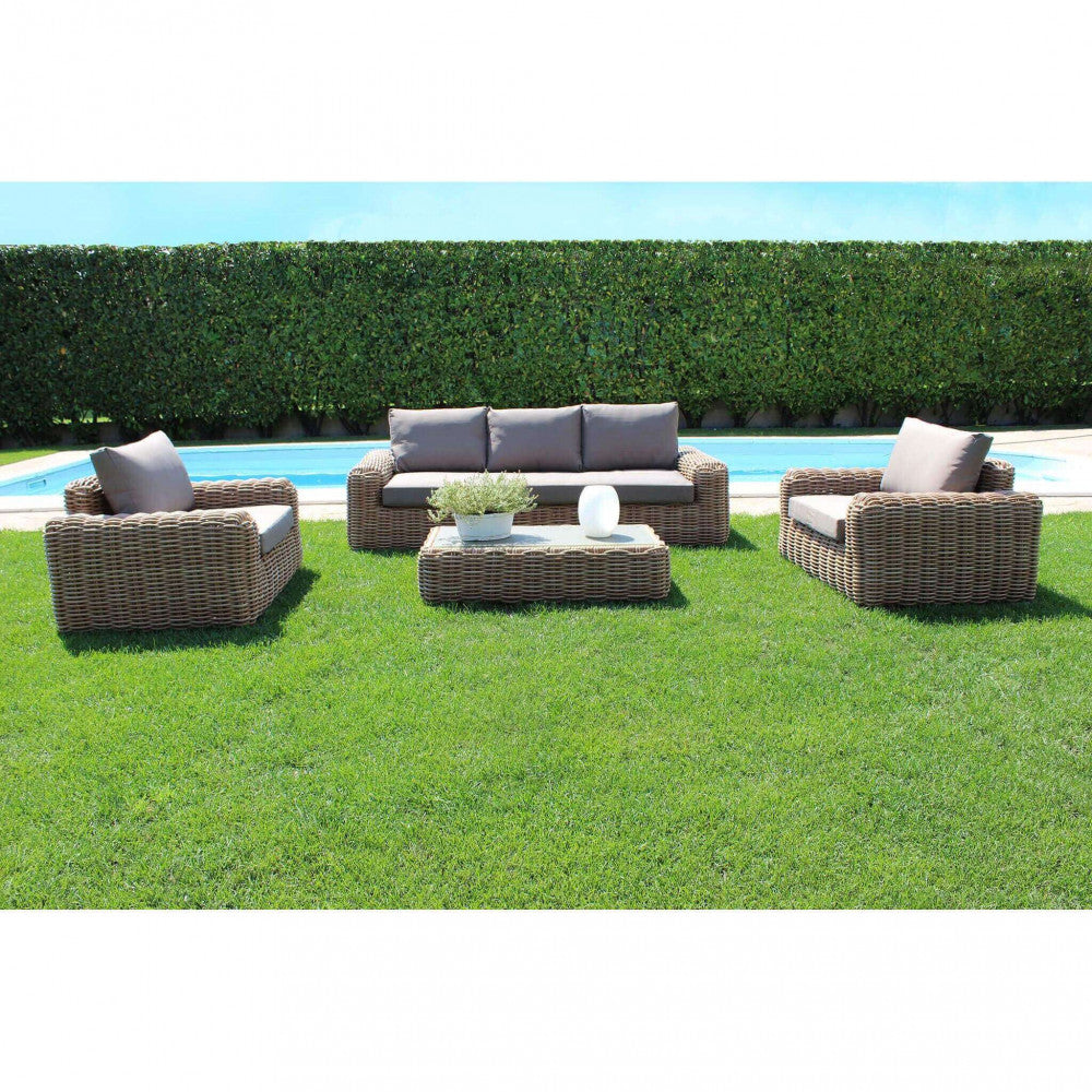Struttura in alluminio, wicker naturale cuscini marroni 12 cm vetro tavolino 8 mm