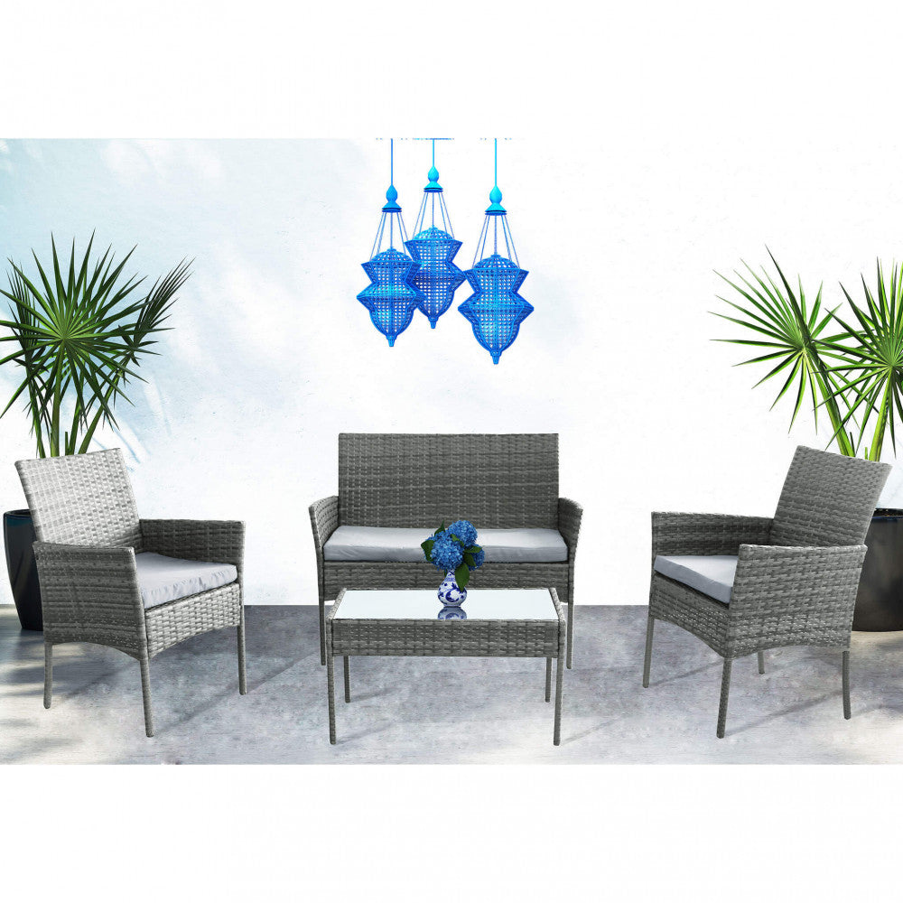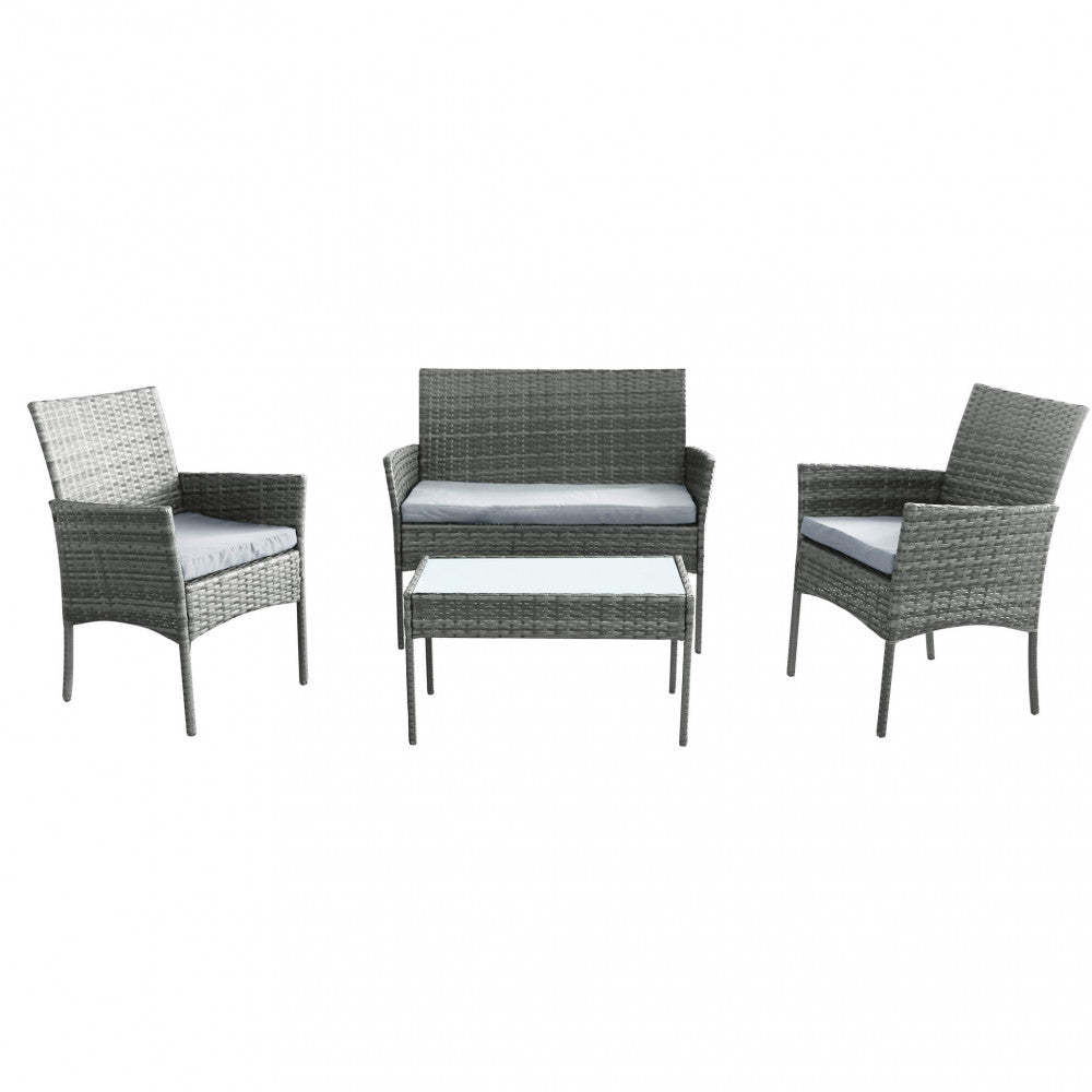 Struttura in metallo, wicker grigio o marrone materiale uv protection cuscini spessore 4 cm, vetro tavolino 5 mm