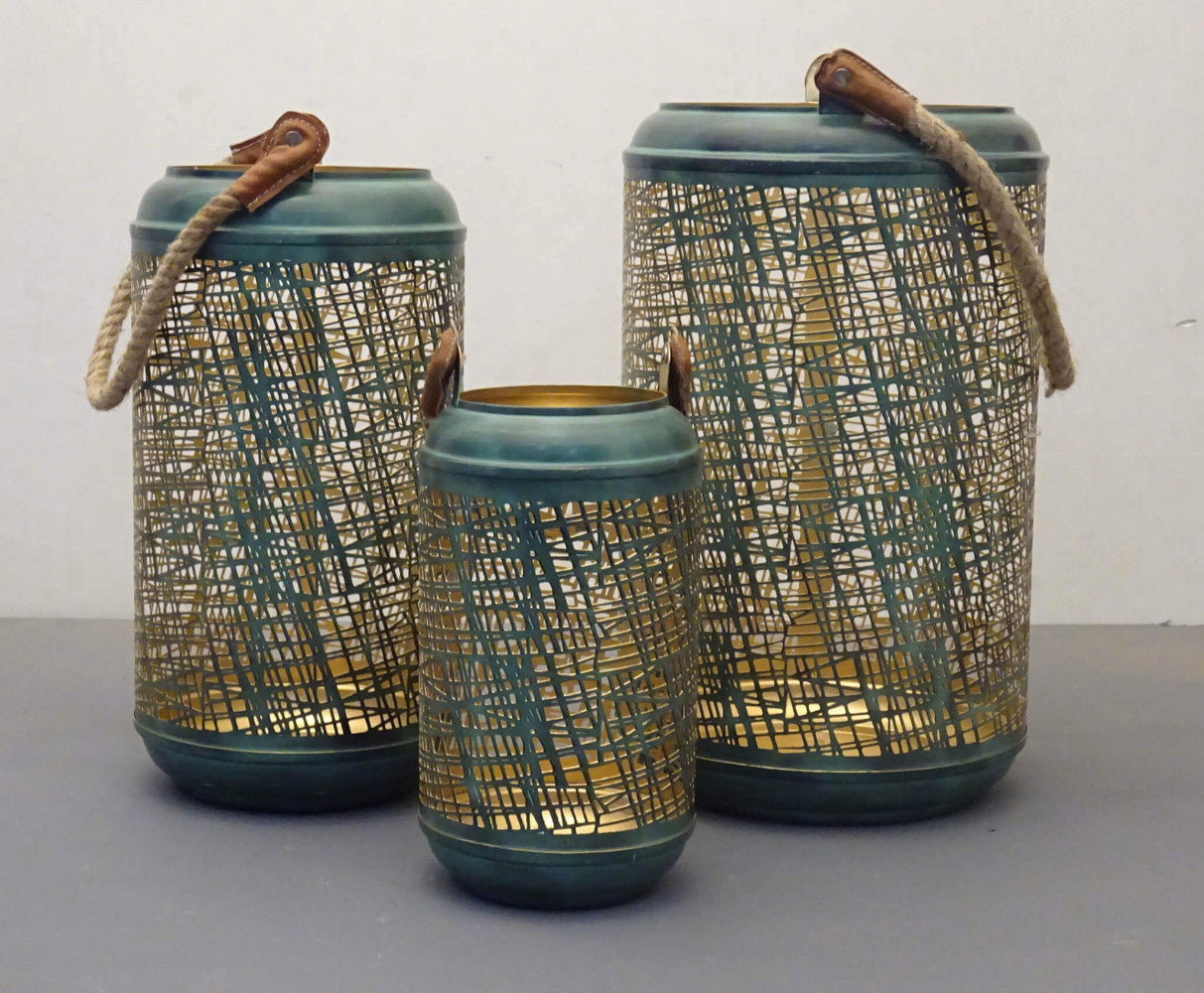 Lanterna in metallo con decoro nera o verde con interno oro e con manico in corda di juta