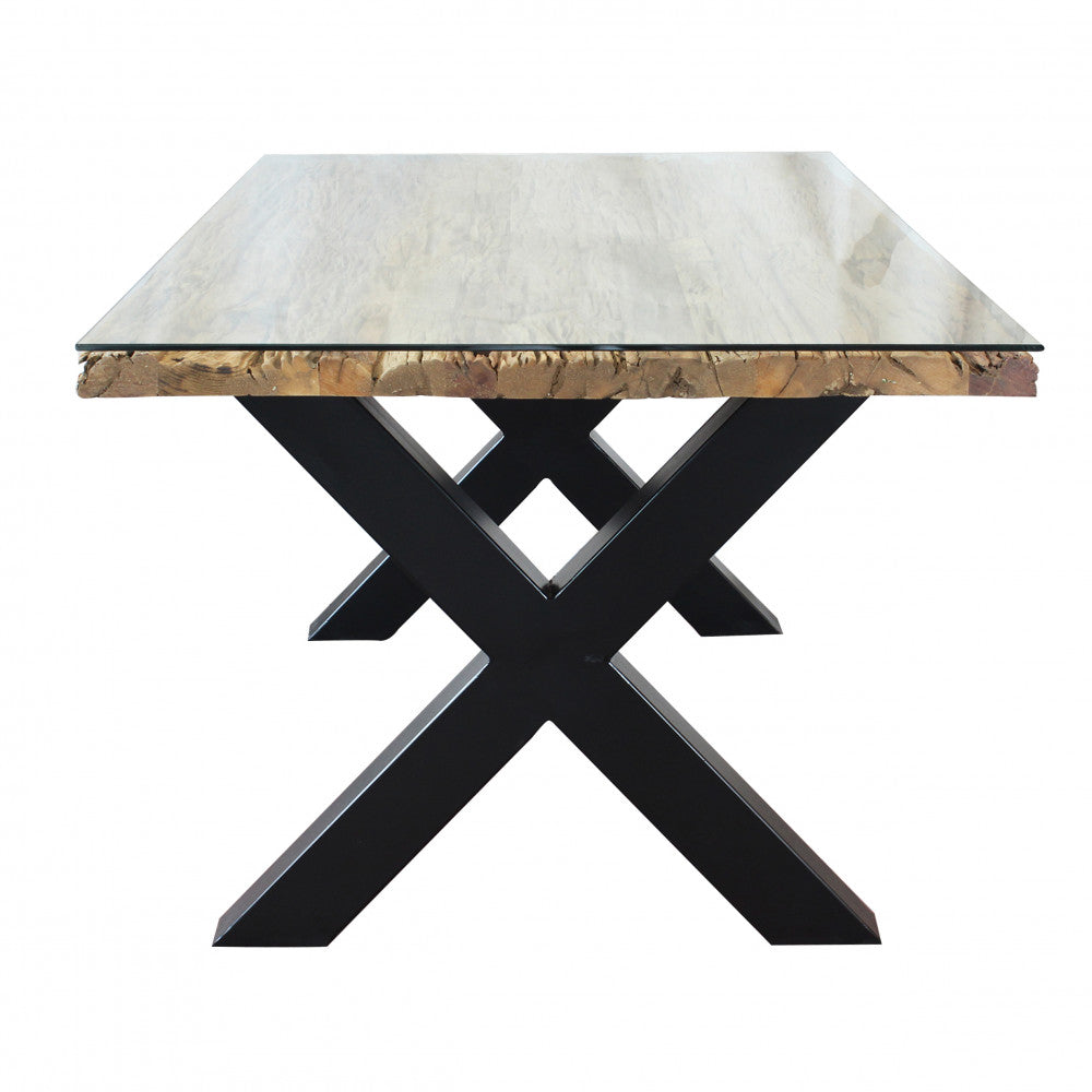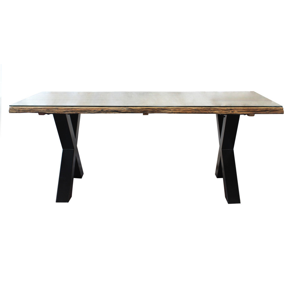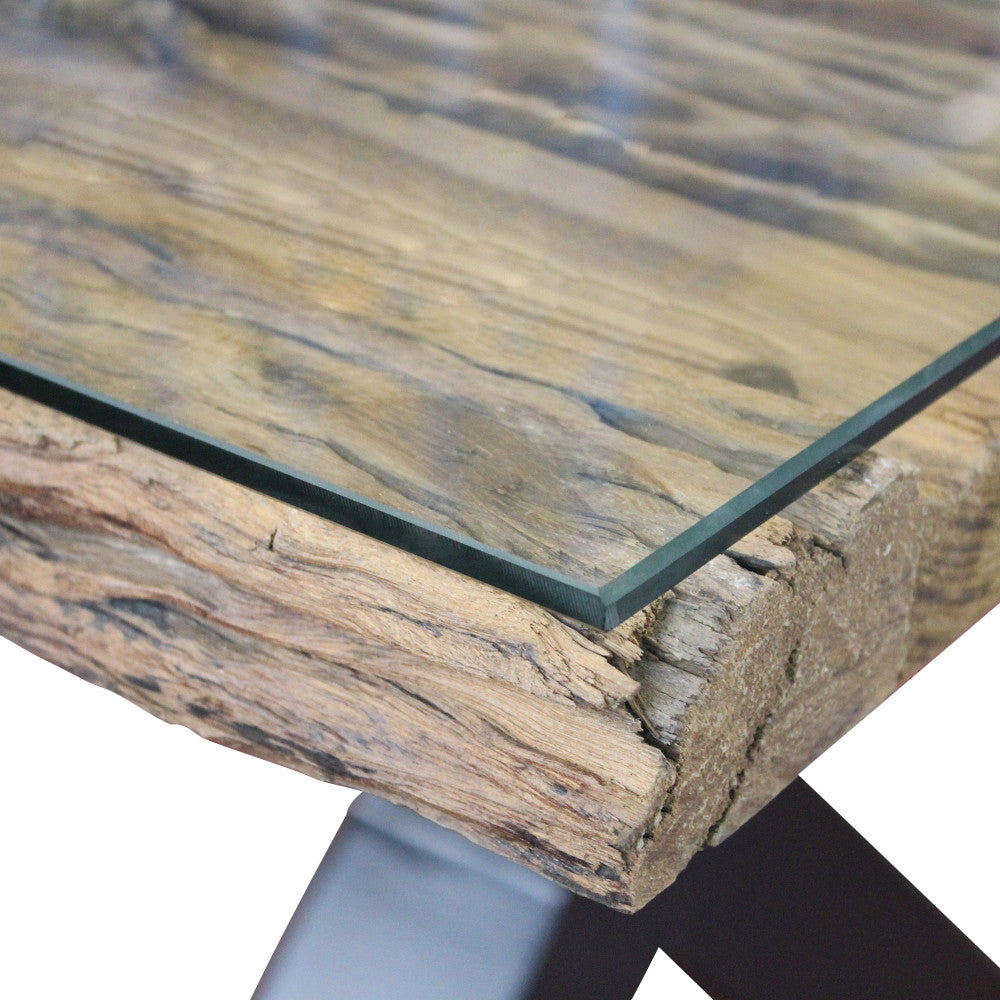 Tavolo con piano in legno ferroviario riciclato e vetro temperato struttura in metallo